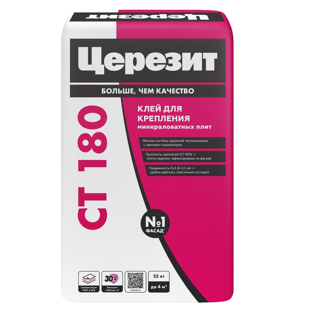 Клеящий состав марки CT 180 разработан для монтажа теплоизоляционных плит из минеральной ваты на основания минерального происхождения. Незаменим в устройстве наружной фасадной теплоизоляции системы Ceresit WM.