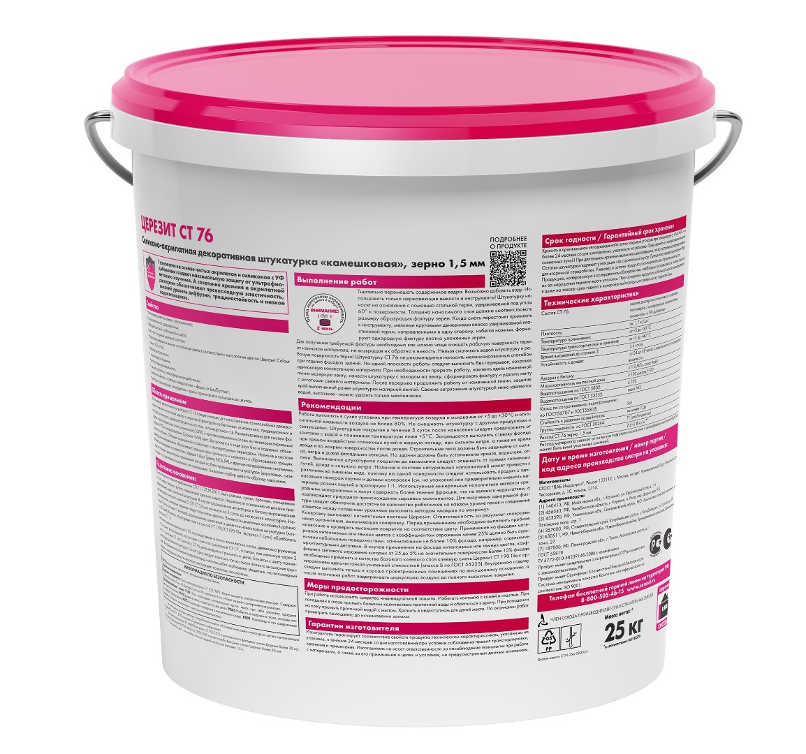 CT 76 обладает высокой устойчивостью к колебаниям температуры и включает в себя армирующие микроволокна, благодаря чему обеспечивается повышенная прочность покрытия и защита от образования трещин. Штукатурку можно колеровать в широком спектре оттенков, используя системы Ceresit Colour System, NCS, RAL, Intense и другие. Особенно важно отметить возможность применения темных и ярких цветов, использование которых затруднено или невозможно при работе с традиционными акриловыми и силиконовыми штукатурками. Также доступен индивидуальный подбор оттенка по образцу клиента.
