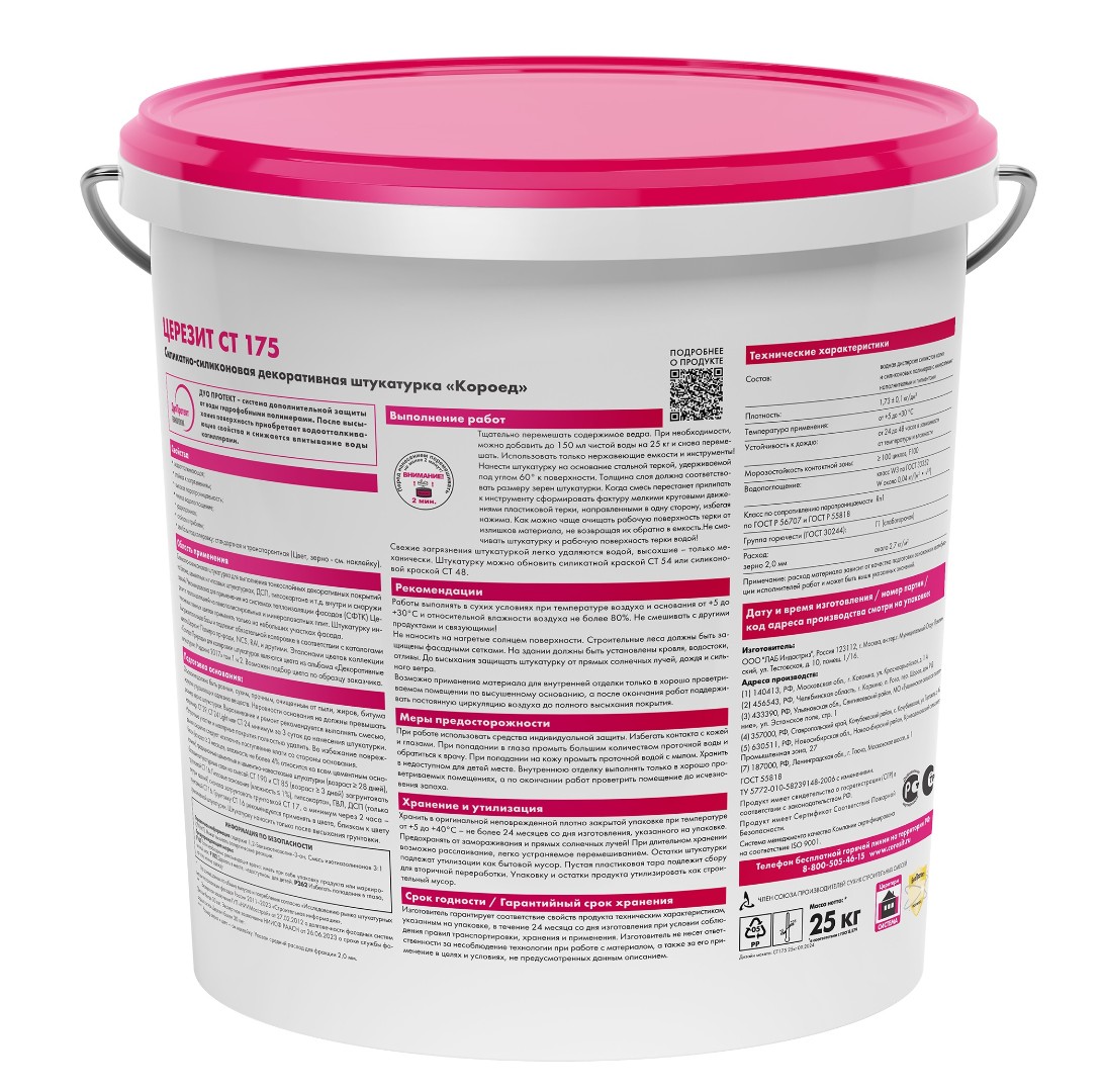 Штукатурка СТ 175- силикатно- силиконовая декоративная штукатурка, применяется для создания тонкослойных декоративных покрытий с зернистой фактурой « короед» на штукатурке, гипсокартоне или непосредственно на бетонных плитах. Может применяться как внутри, так и снаружи зданий. Обладает свойствами повышенной паропроницаемости и низким влагопоглощением. Является рекомендуемой штукатуркой в системах утепления фасадов пенополистеролом.