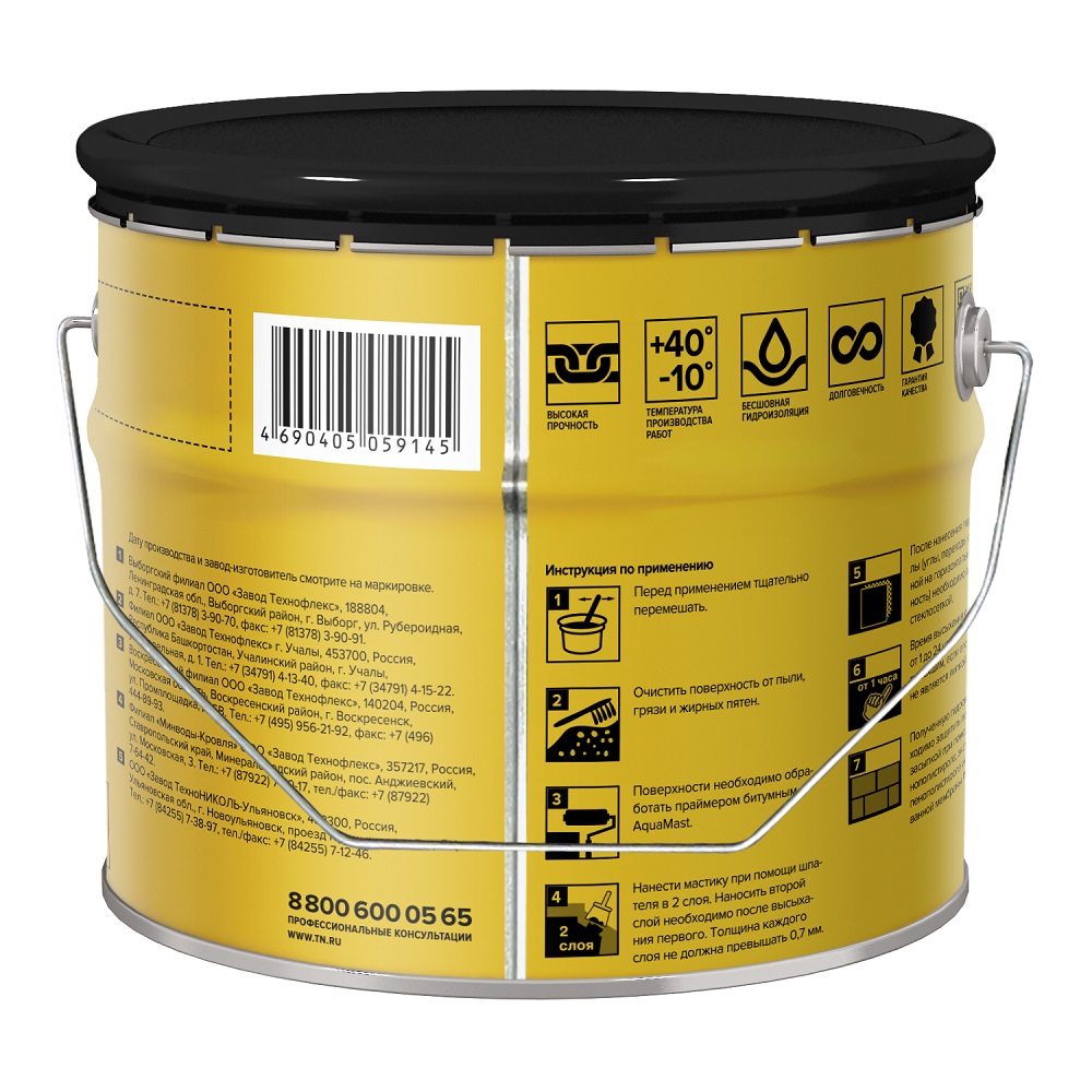 AquaMast можно наносить при температуре от -10°С до +40°С. Если температура ниже +5°С, то перед нанесением мастику необходимо выдержать при комнатной температуре не менее суток.